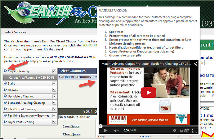 Let me start by saying that putting pricing online is KEY for many many businesses out there - you’re included. I have been preaching this in the carpet cleaning industry (service industry) for the last 5 years! Consumers are busy and becoming more and more sensitive to time everyday. If you aren’t there when they are thinking of you, and how they want you - pricing starts to become a bit irrelevant. They will find someone that is there. I am not saying that pricing is the ONLY thing they consider - IT IS NOT! BUT - as stated by Thad, it is a vital part of the sales cycle. That is why we built feature in FittleBug that allows you to answer a prospects question at every level of the sales offering that they might have a question. That’s the good news! The bad news is that I am just getting around to sharing it with your industry. BUT, I will be there at the HUGE Convention. The best that I can do to share this feature is to share one from the carpet cleaning world… earthpro. Use zip code 60174 to get in. You can hover over anywhere there are “blue” question marks" or information icons. Here is an image of what a consumer can do to get answers to the options in front of them. BTW - you can place (regular text, html, links to images, embed videos, etc)