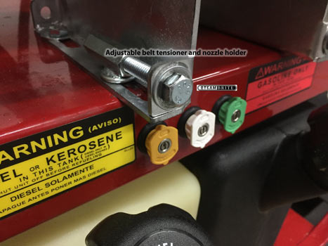 Spent the last hour digging up all the pics and vids I could find on it. You’re missing half the tensioner, it must have vibrated out or it was misplaced and never made it back on. They call it Hydro Tek’s EZ Align belt tensioner. The carriage bolt needs to be run the opposite direction which provides the stand off for the custom hex rod the tensioner bolt pushes off of. Just tension it another way.