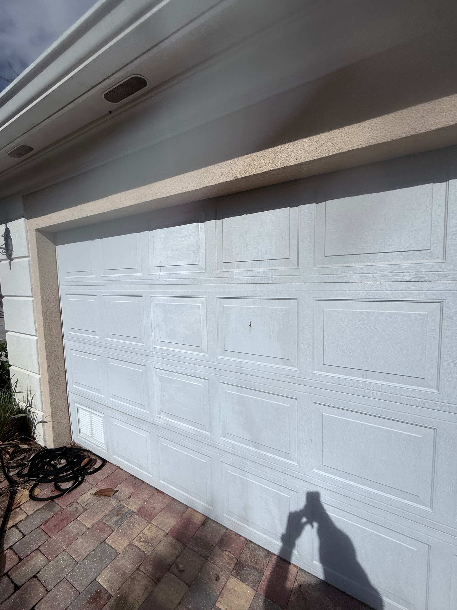 The garage door has some strange blotchy discoloration. I’m already aware of oxidation and I checked for it — wiped the surface thoroughly and there was no chalky residue, no transfer, nothing that points to typical oxidation.