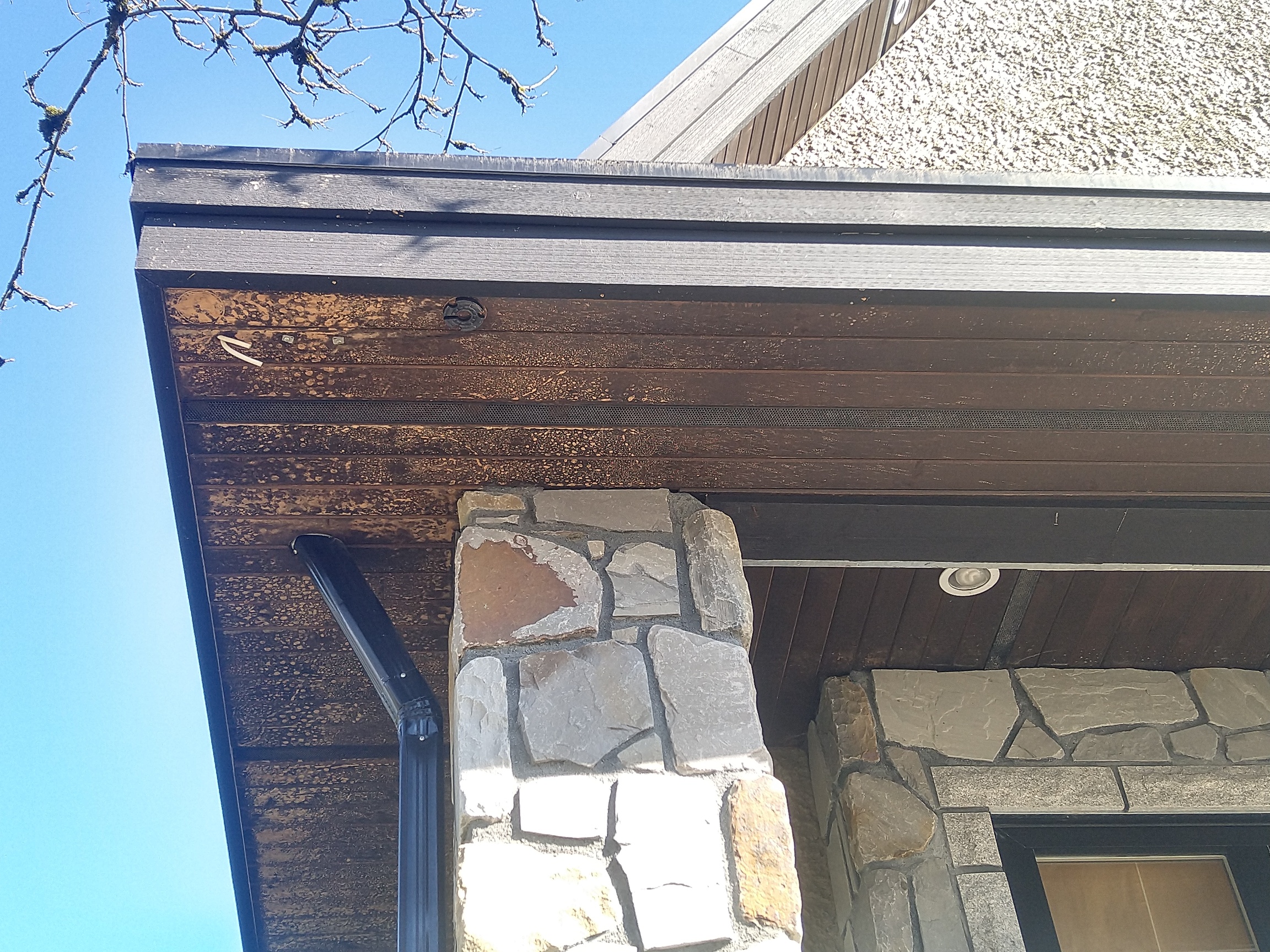 This house is going to be painted again anyway, so it doesn’t matter in this case, but next time I do a house with soffits like these, how can I avoid bleaching out the stain on them?