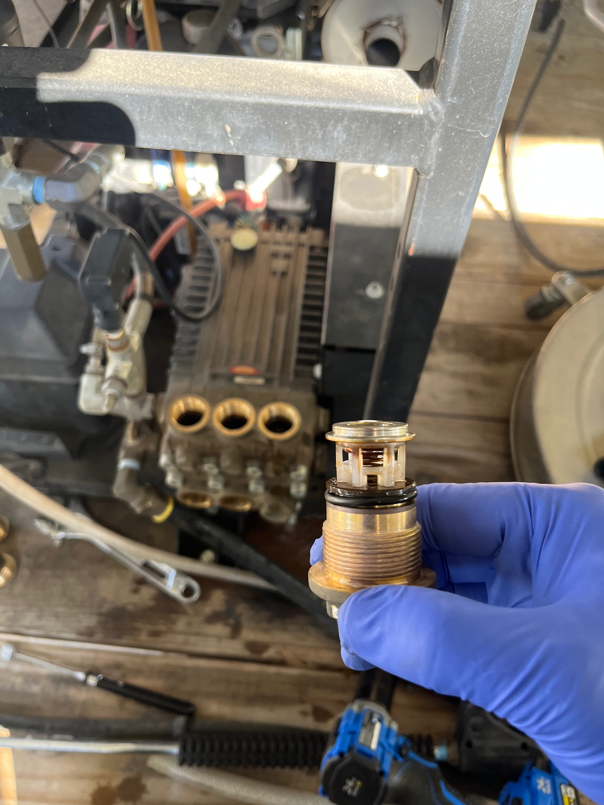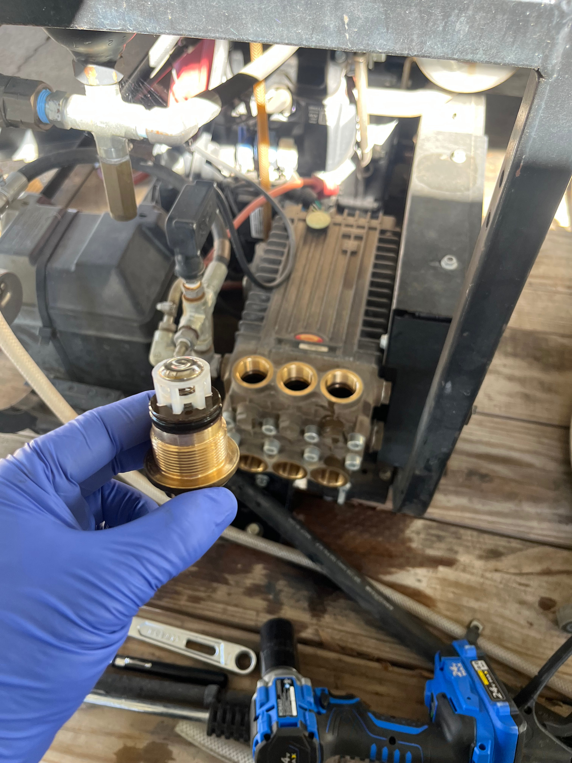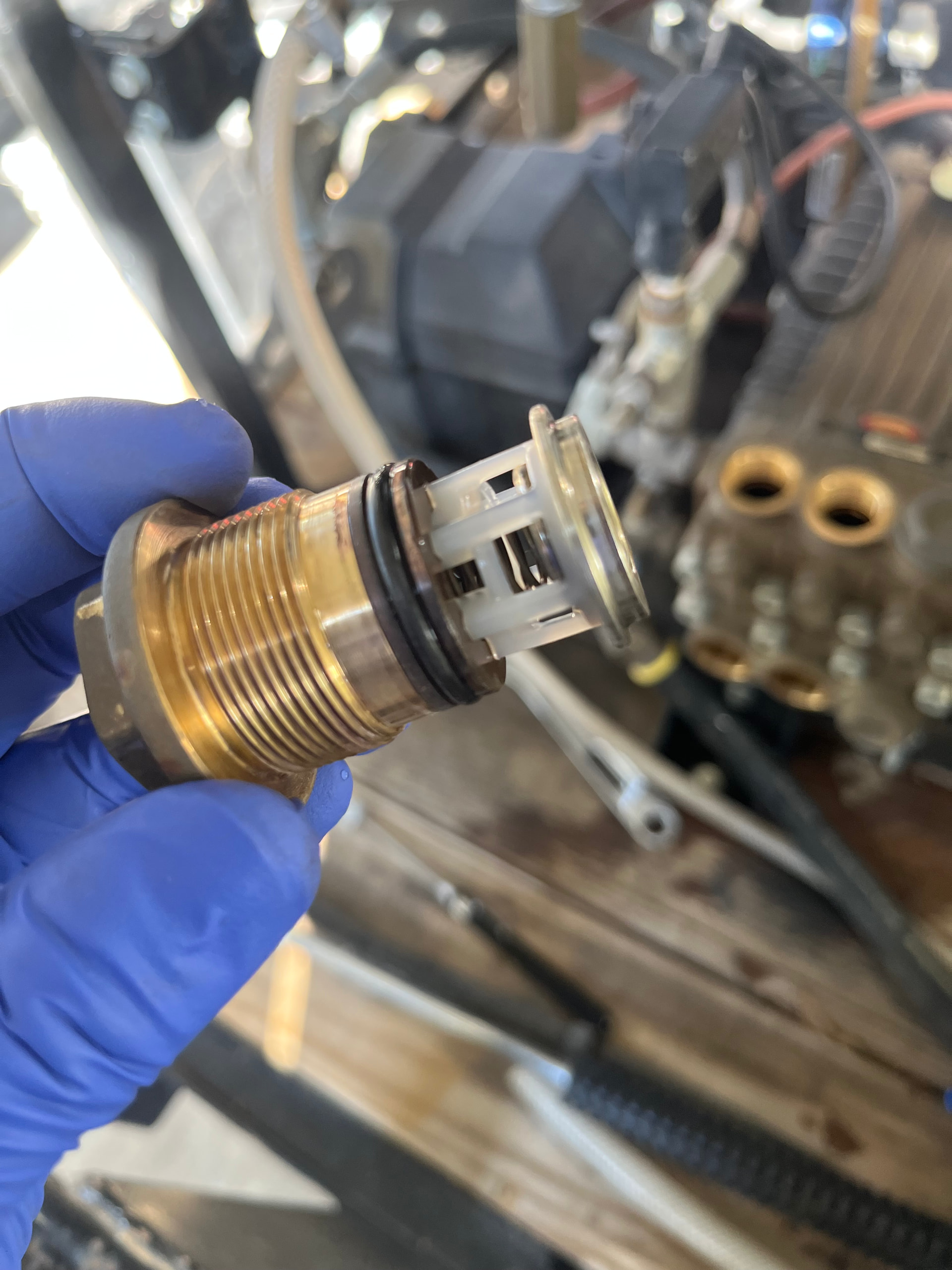 After rinsing the valves and checking they all seemed to seal i reinstalled them and ran the pump. I managed to extract the top plates on those two bottom valves and they seat normally: the only one that I’m iffy about is the 3rd top valve; pushing down with my finger and release would sometimes have it sit at a weird angle but I chalked it up to how I was pressing it down. Pressed straight down it would come back up normally. Still only getting around 2600psi. I checked the bypass and have zero flow into the tank when pulling the trigger. Adjusting the unloader didn’t affect the bypass flow so I’m wondering if the issue lies there. Surface cleaner runs okay enough to clean slowly if I have to. Nearby parts shop wanted $350 for a kit 169 valve replacment kit. Online its $160 with shipping.