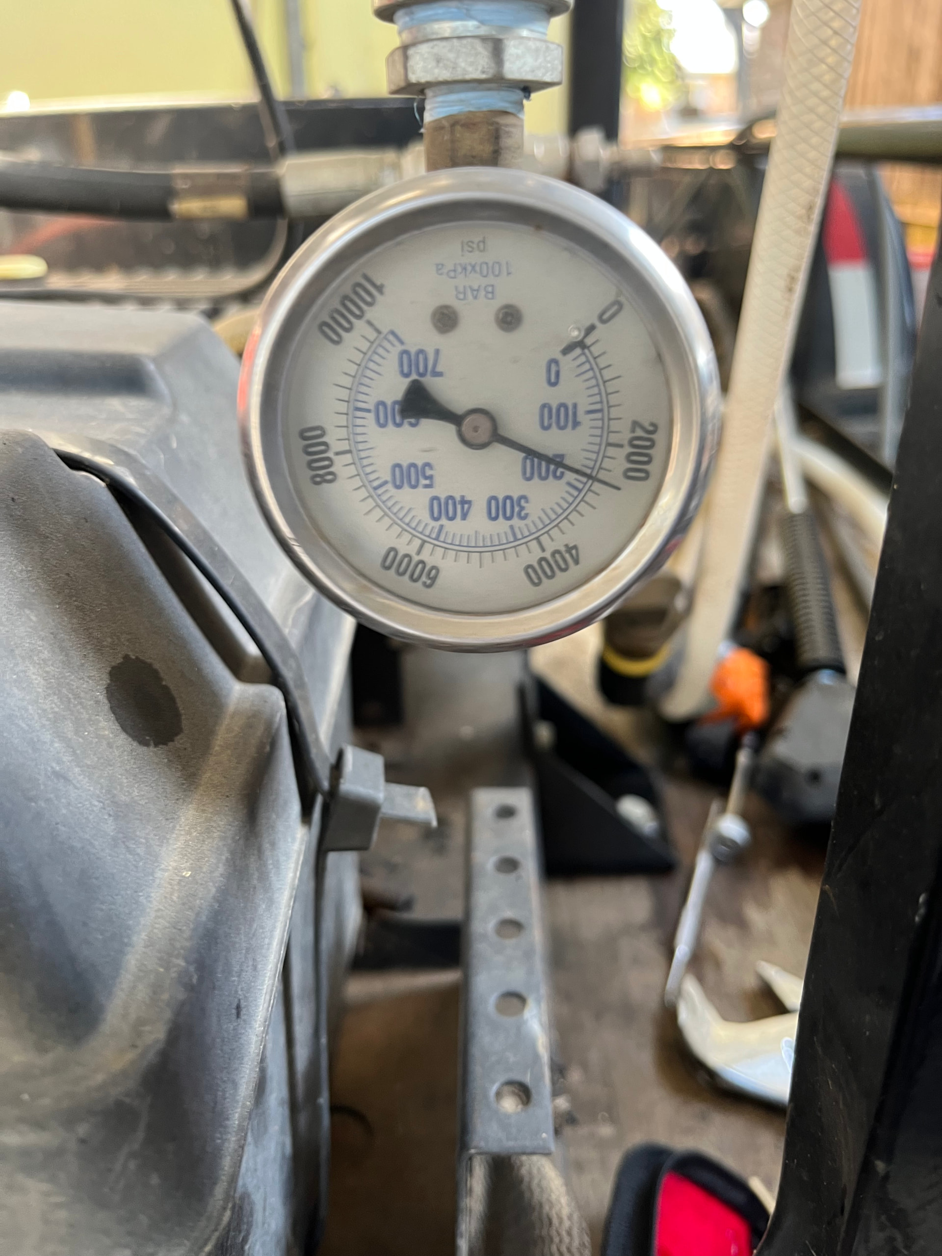 Ok so maybe the gauge was f’d up all along or back pressure broke it today. Was doing a small patio job when I saw this while gassing up. Hoping none of that fluid got into the pump somehow.