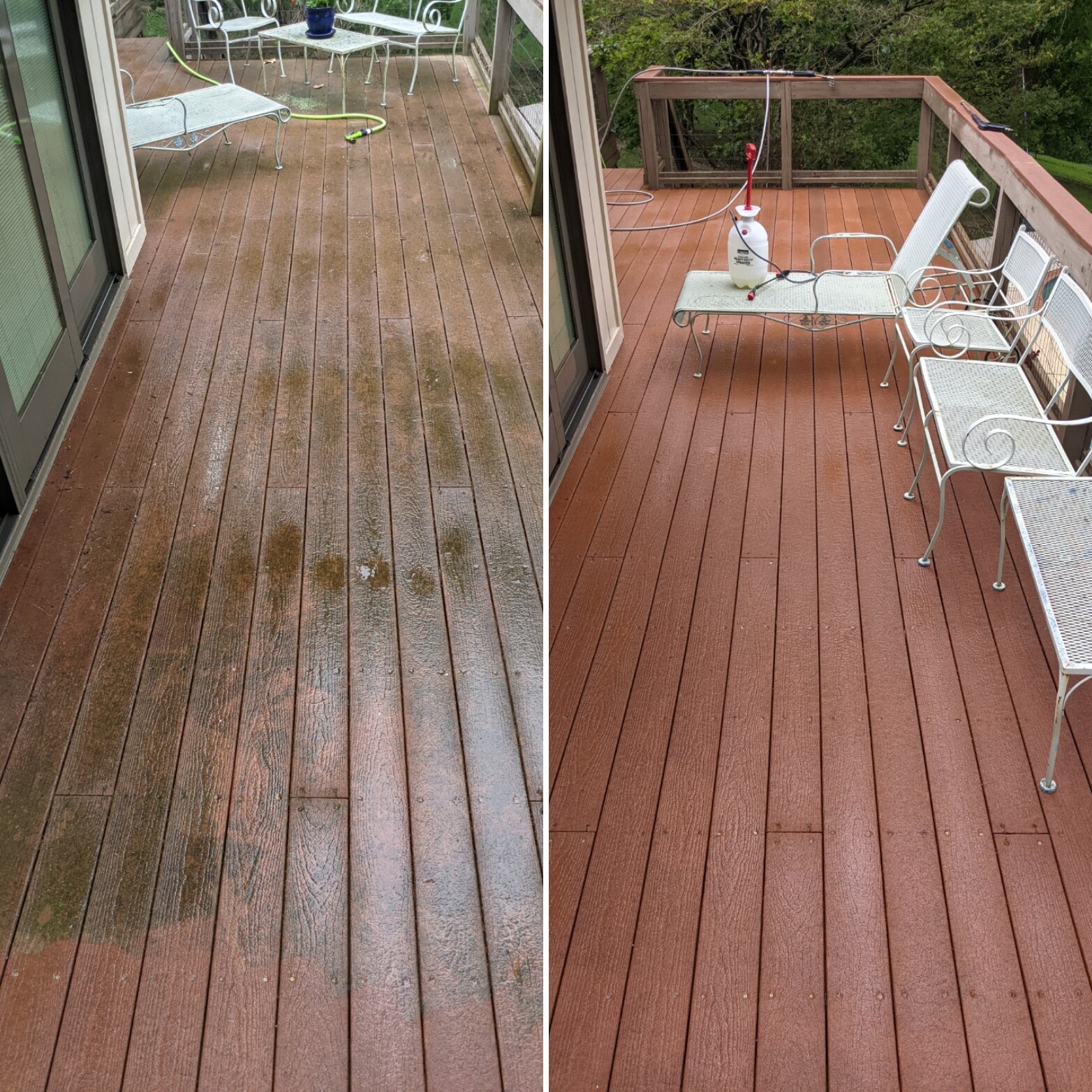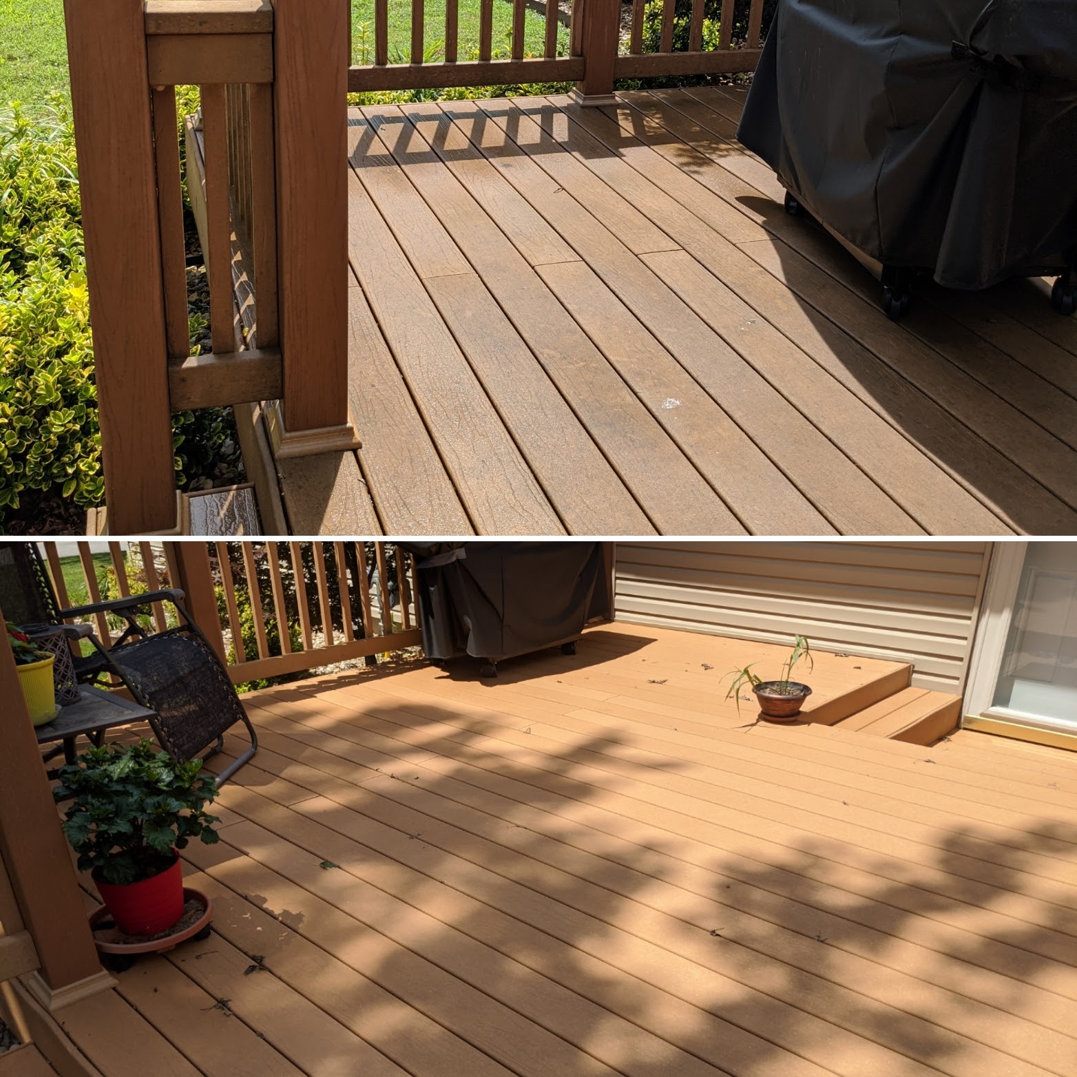 No worries man. I prefer cleaning composite to cleaning real wood. It’s much less tedious and you can really move. I use a 12v for deck jobs and I usually go about 1/3 to 1/2 an ounce of surfactant to gallon of mix to cut down on rinse time. Just shoot for a 7-10 minute dwell time and you should be golden. Good luck with it.