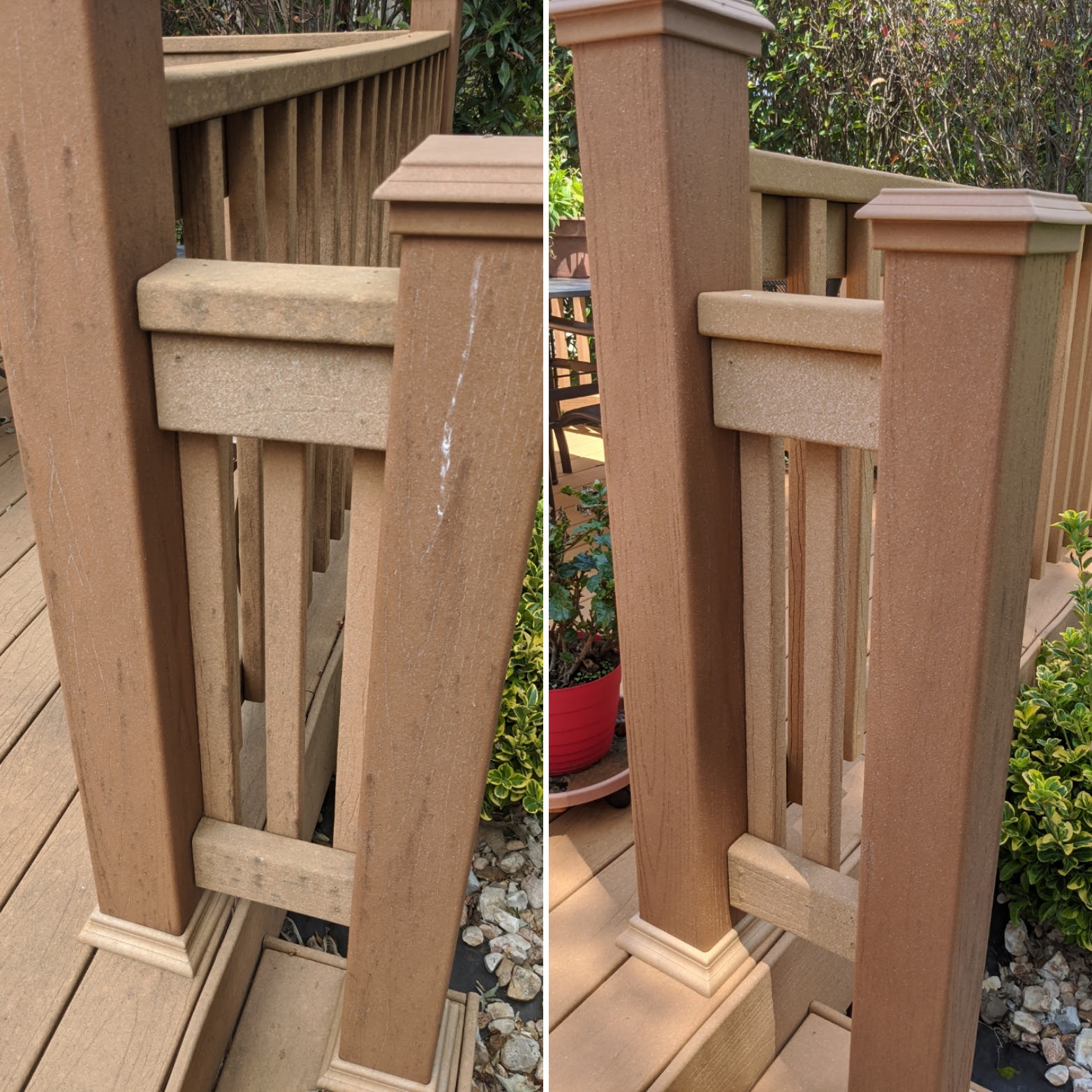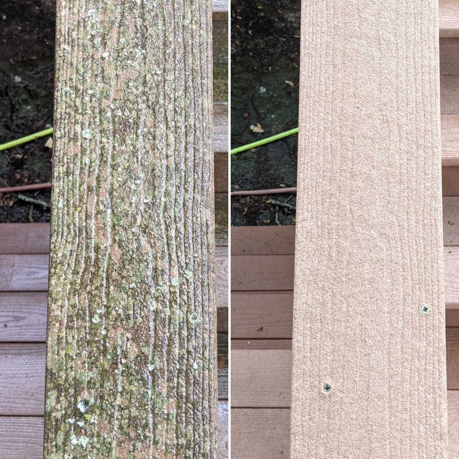 I looked at a house yesterday that has two issues that I’m puzzled about. One is the plastic deck, you know, the fake wood. Not only is is moldy and has lichen growing on it, it’s very oxidized, I can scrape material off with my fingernail. I can remove the organics with SH, but that’s as far as I think I should go. Anyone have suggestions for cleaning weathered fake wood and not disturbing the oxidation?