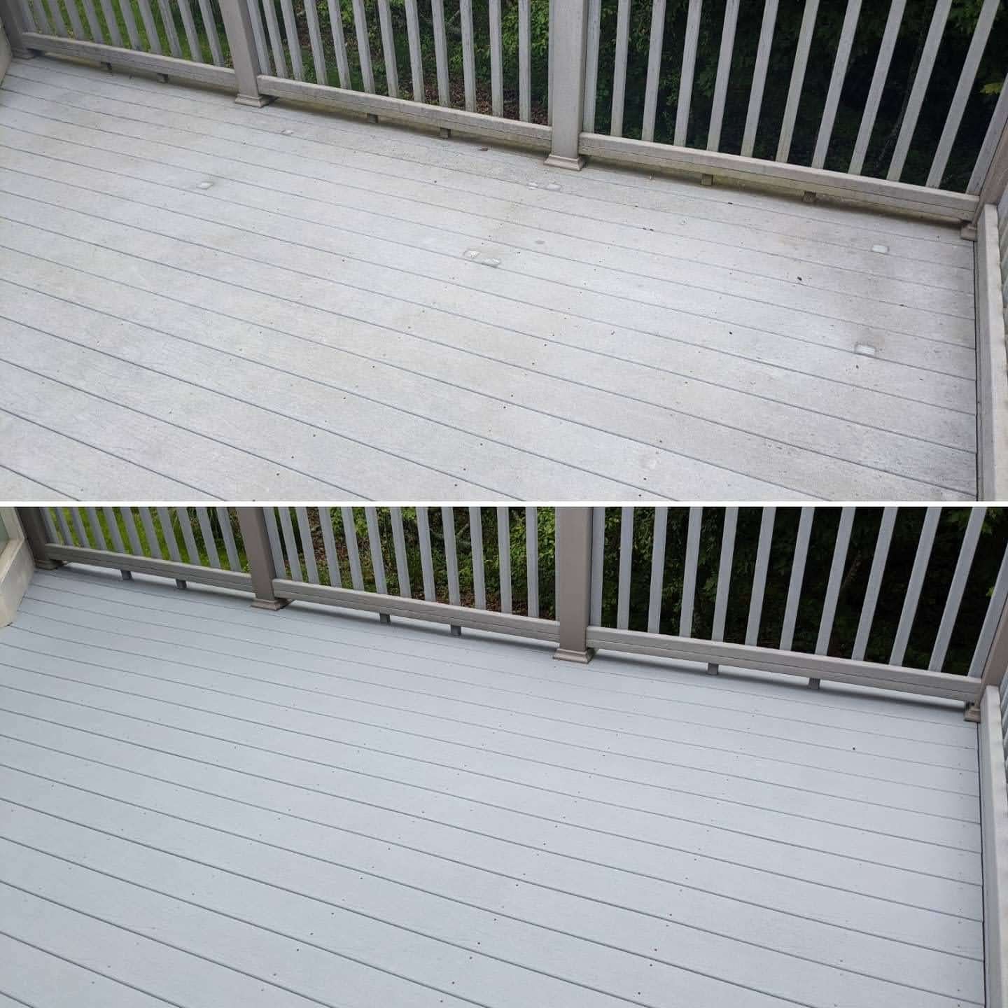 No brush. Quick prewet (like the Flash quick if you’re using 8gpm like I do), start at 3% and go up or down depending on dwell (do a test spot first), 1000psi wood tip on my JROD, and then a thorough rinse. I’ve done probably a dozen or more composite decks with this method and they always clean up beautifully. I’ve changed phones a few times in the last few years but I’ll see if I can find some more pics somewhere for you.
