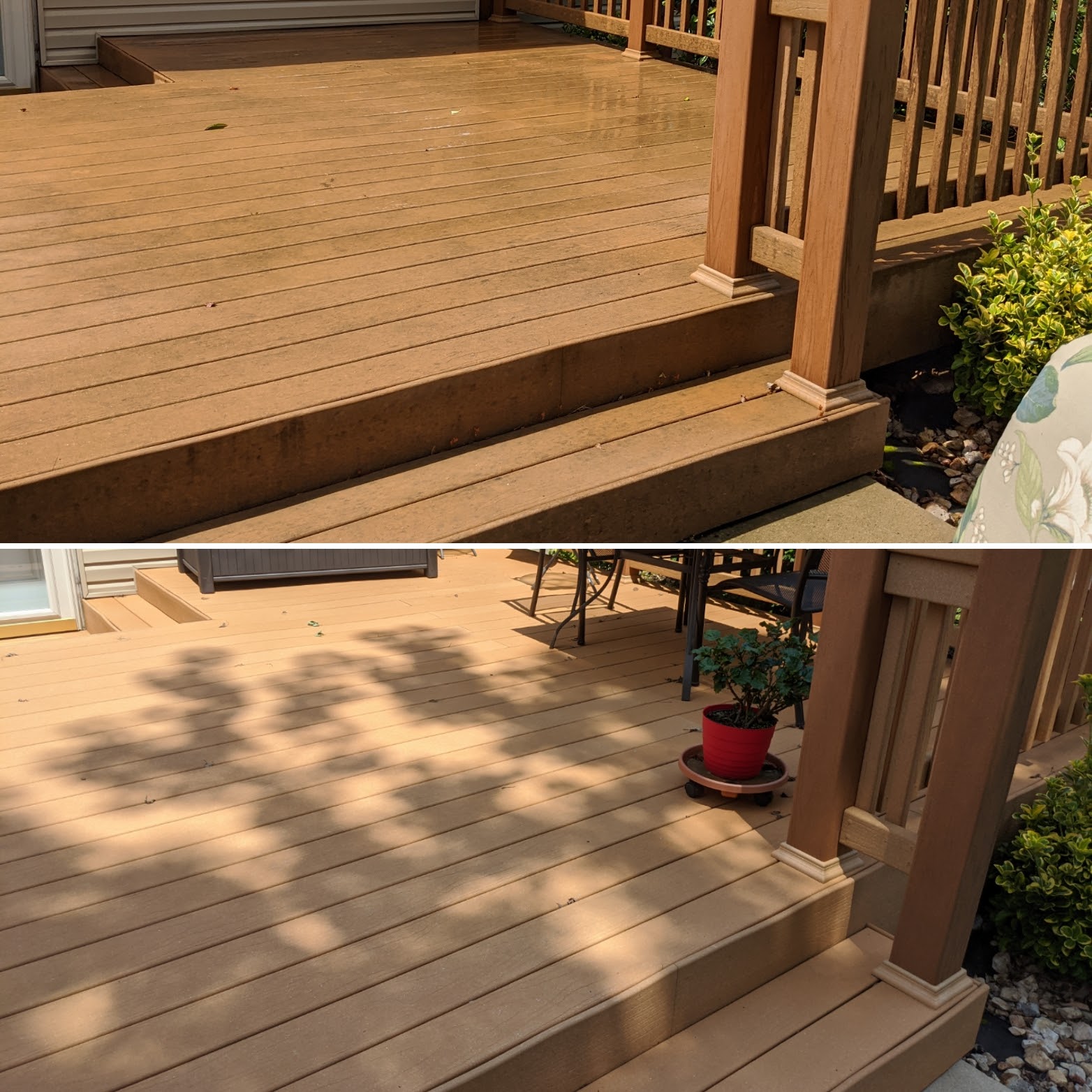 Welcome. How old is the composite deck? Typically you want to get the oxidation off. Hit it with about a 2% mix, let dwell a few min and then you can just pressure wash it off. just be sure to do it kind of like you would with real wood and make continuous pass on the boards. Can go up to about 2000psi. I’ve even used a surface cleaner on some bad ones, but you better know what you’re doing. Post a pic or 2 if you have.