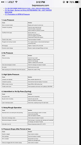 This troubleshooting guide might help you out if the link works. This forum is primarily for contractors and if you are a contractor in this industry, filling out a signature will allow other members of this forum to know where you are located. As a result they will be much more likely to respond with sound advice. However, the pressure washer you are currently using is a consumer grade pressure washer at best. It only has a two year warranty after all. Members on this forum don’t use and or service consumer grade pressure washers. I would suggest for you to buy a professional grade machine with at least 4 gallons per minute and belt driven. IMHO if you have to replace the pump on your current pressure washer you’re throwing away money that would be much better spent on better equipment.