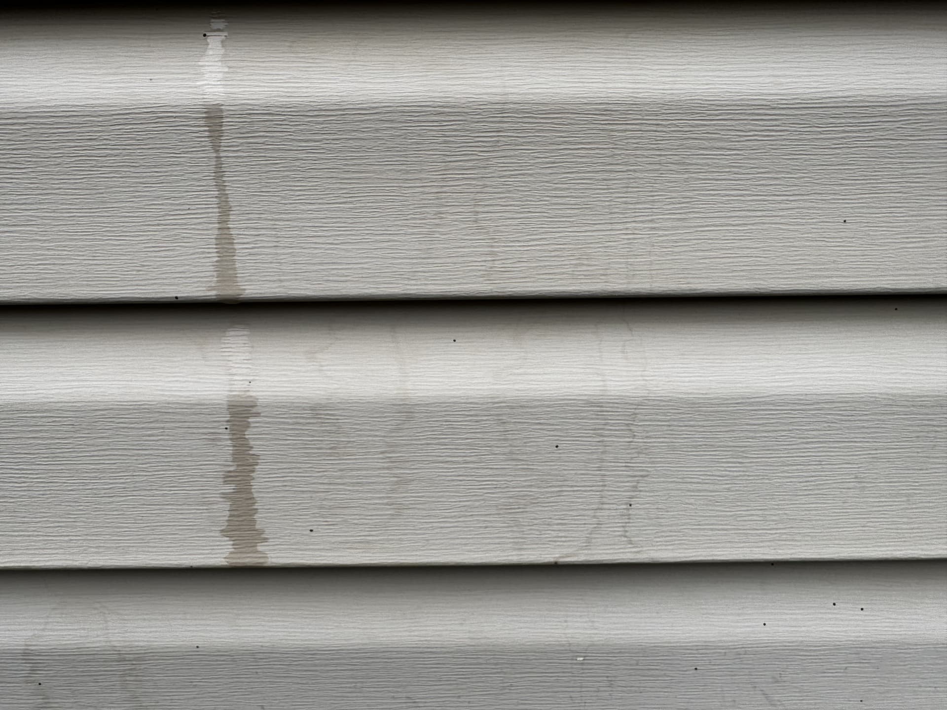 The only other thing I can think of is that you hammered water underneath or behind the siding and who knows what came out and leaked down the wall. It could be lots of things, I had one customer tell me they sprayed “cleaning stuff” on their siding and that was the discoloration I saw (before cleaning). If it is an older home (think 70-80’s) sometimes the people used a variety of water barriers, one of which was like a roof felt. Any water gets on that and the siding goes brownish. Almost pooped myself the first time I saw it.