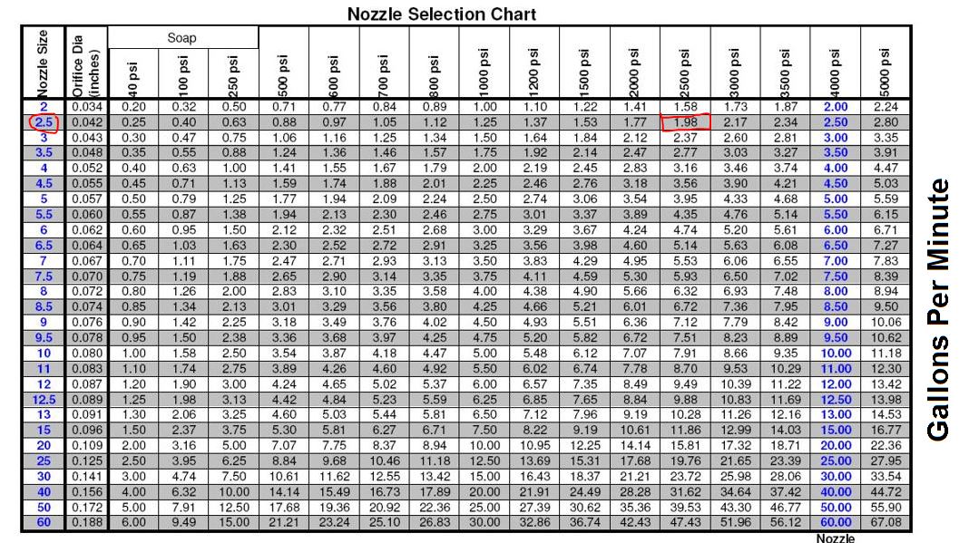 Remember you have two nozzles on your surface cleaner, so your gpm is 2 per nozzle. You want 25025 nozzles for it, that will give you about 2500 psi.