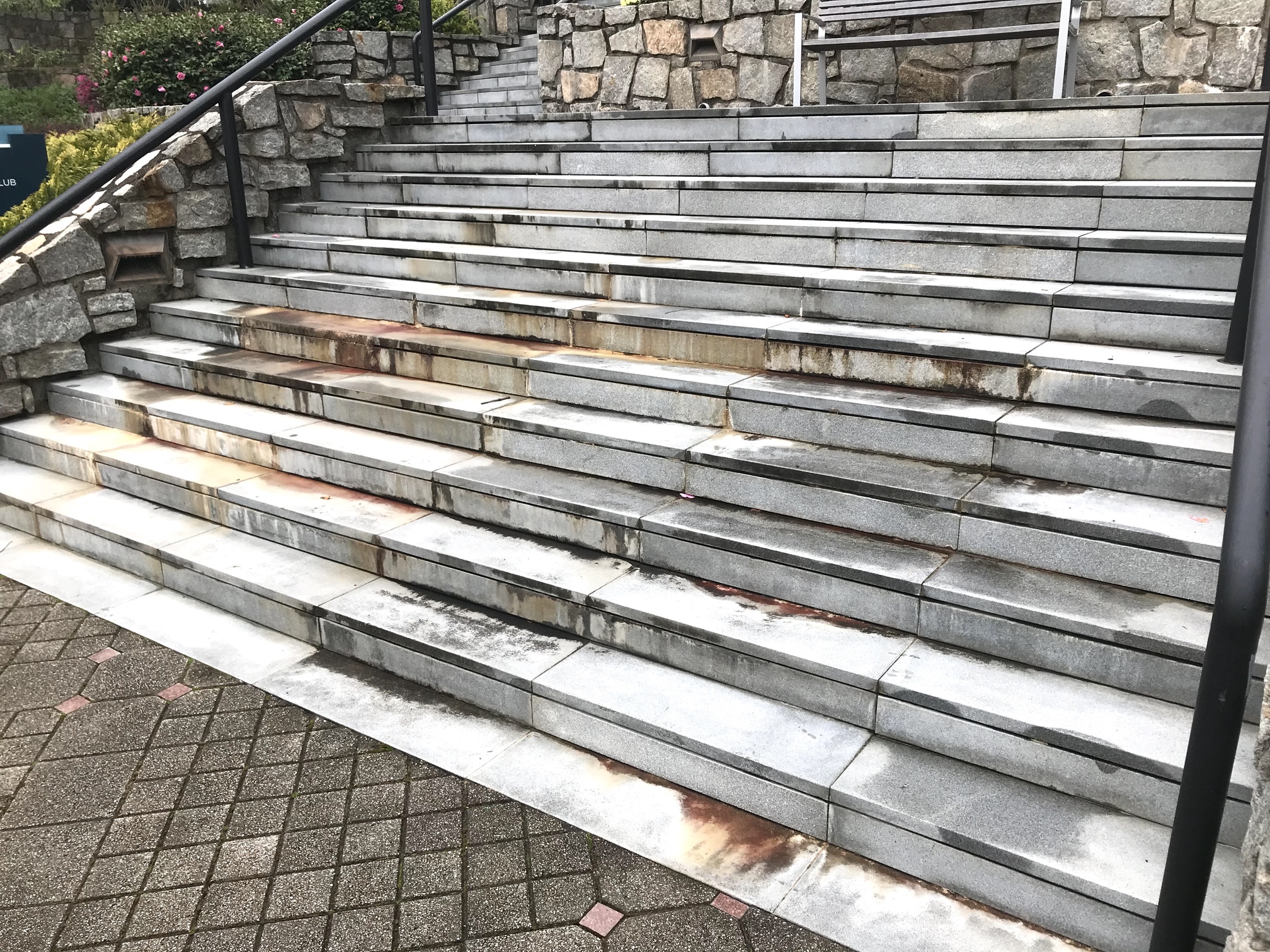 Hello all… I need your help! We have a commercial customer who needs us to remove the unusual looking stains on the granite steps. Any thoughts on what they are and the best solution to remove them?